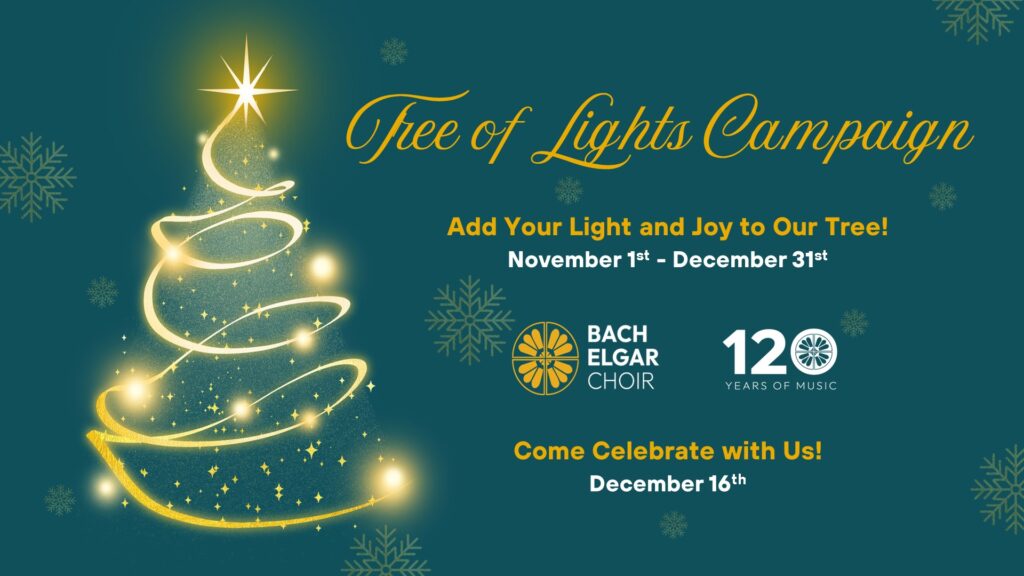 The Bach Elgar Choir’s Tree of Lights Campaign invites you to come together with others in our community in a celebration of music, light, and generosity. Each donation helps light the Tree of Lights – a shining symbol of the warmth, joy, and unity that choral music brings to our community.